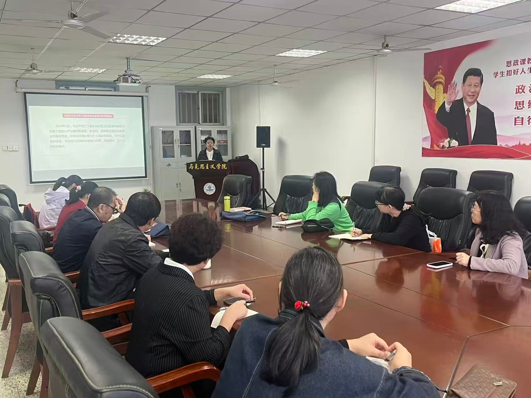 为提升思想政治理论课教学质量,深化对“全面从严治党”专题的教学研究,2025年10月14日下午,习近平新时代中国特色社会主义思想概论教研部在学院小会议室召开集体备课会。本次备课会由李芳云教授担任主讲,张弛老师主持,副院长徐文文及教研室其他教师参与研讨。 首先,李芳云老师以问题导入的方式,围绕“为什么要全面从严治党”“为什么党的十八大以来管党治党宽松软状况得到根本扭转”“如何理解全面从严治党这场伟大自我革命”三个核心问题展开专题讲解。她从多维度出发,深入剖析全面从严治党的深刻内涵与重大意义,呈现出逻辑严密、层次清晰的教学框架。