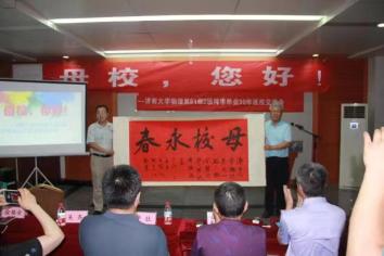校友代表刘志林深情回顾了在学校求学期间的点点滴滴,从济大求学之路到工作奋斗之路,从恩师教导到同窗友谊,他表示,尽管毕业离开母校,但一如既往的关心关注和支持母校的发展与进步,并向物理科学与技术学院徐锡金院长赠送了由中国书协会员、山东省书协行书委员会副主任胡宗江先生书写的“母校永春”书法作品。